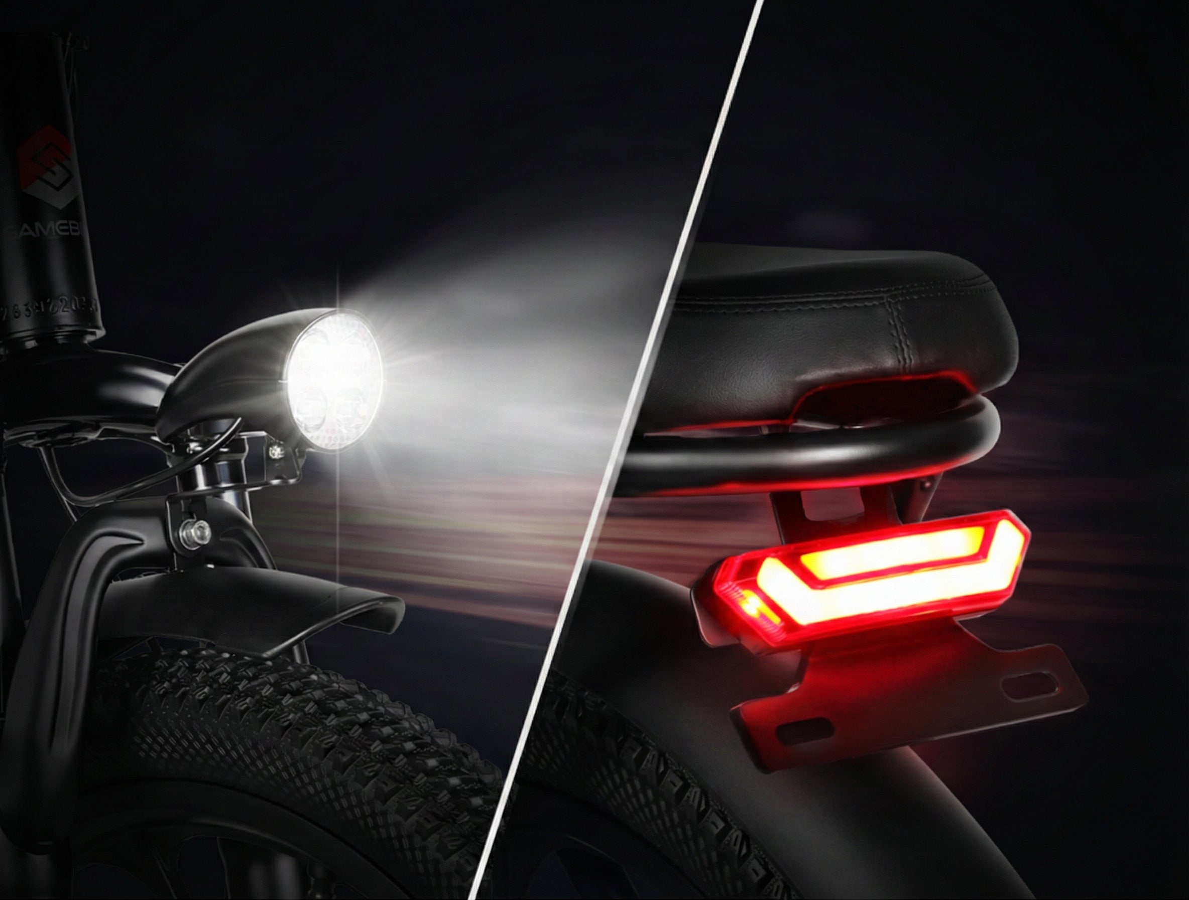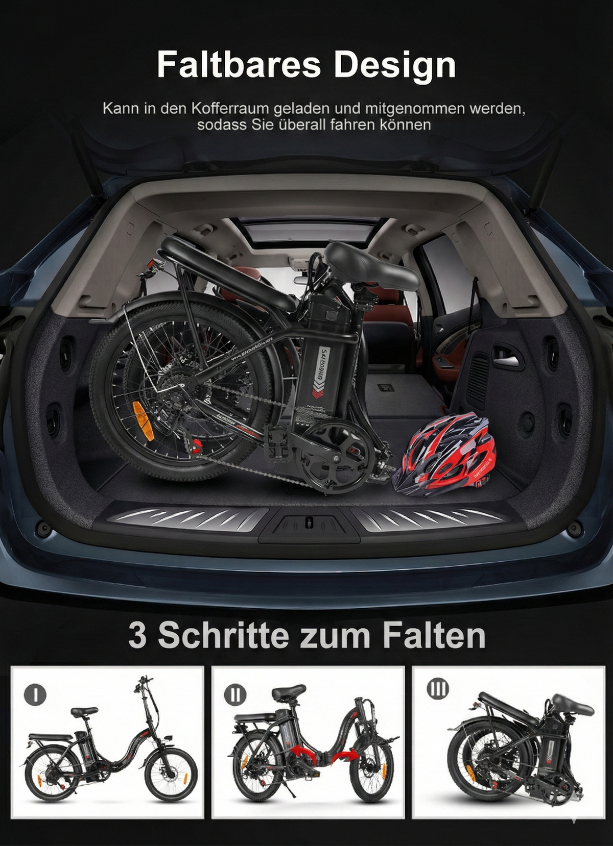 Das Bild hebt das praktische, faltbare Design des E-Bikes hervor, das sich kompakt in drei Schritten zusammenklappen und problemlos im Kofferraum eines Autos transportieren lässt, um maximale Mobilität zu gewährleisten.