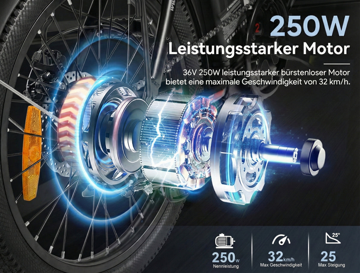 Erleben Sie die perfekte Symbiose aus fortschrittlicher Ingenieurskunst und kraftvoller 250-Watt-Leistung für eine dynamische und mühelose Fahrt, selbst bei starken Steigungen.